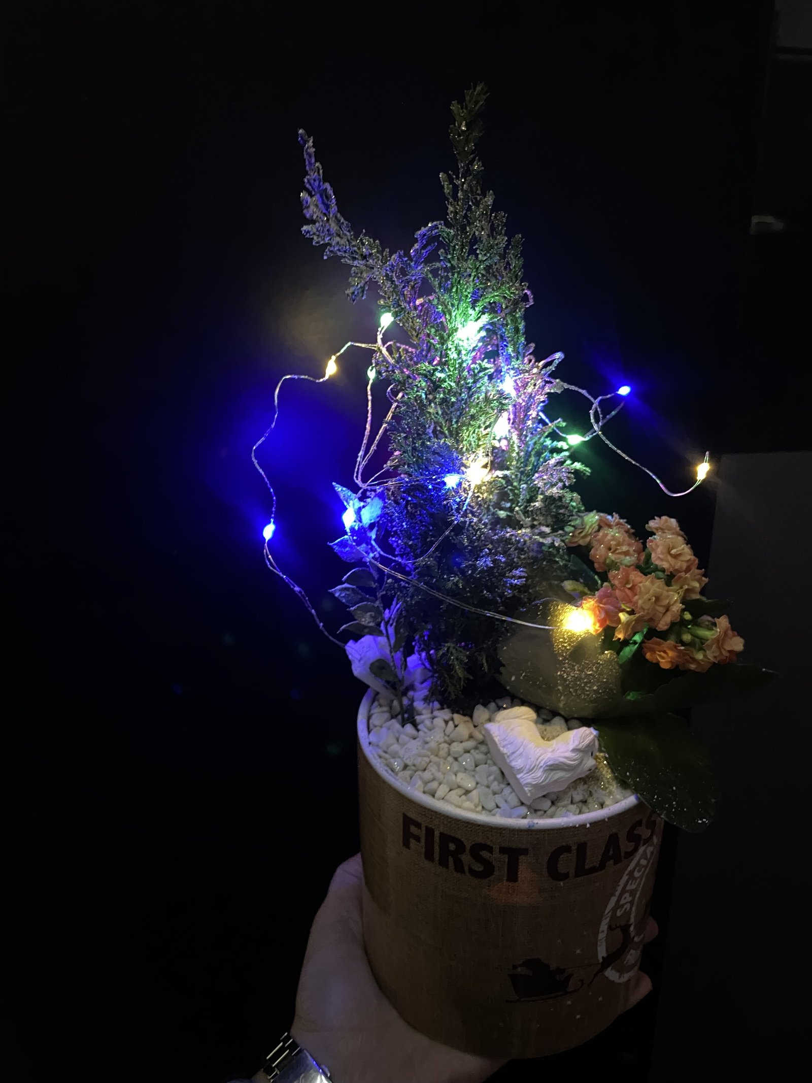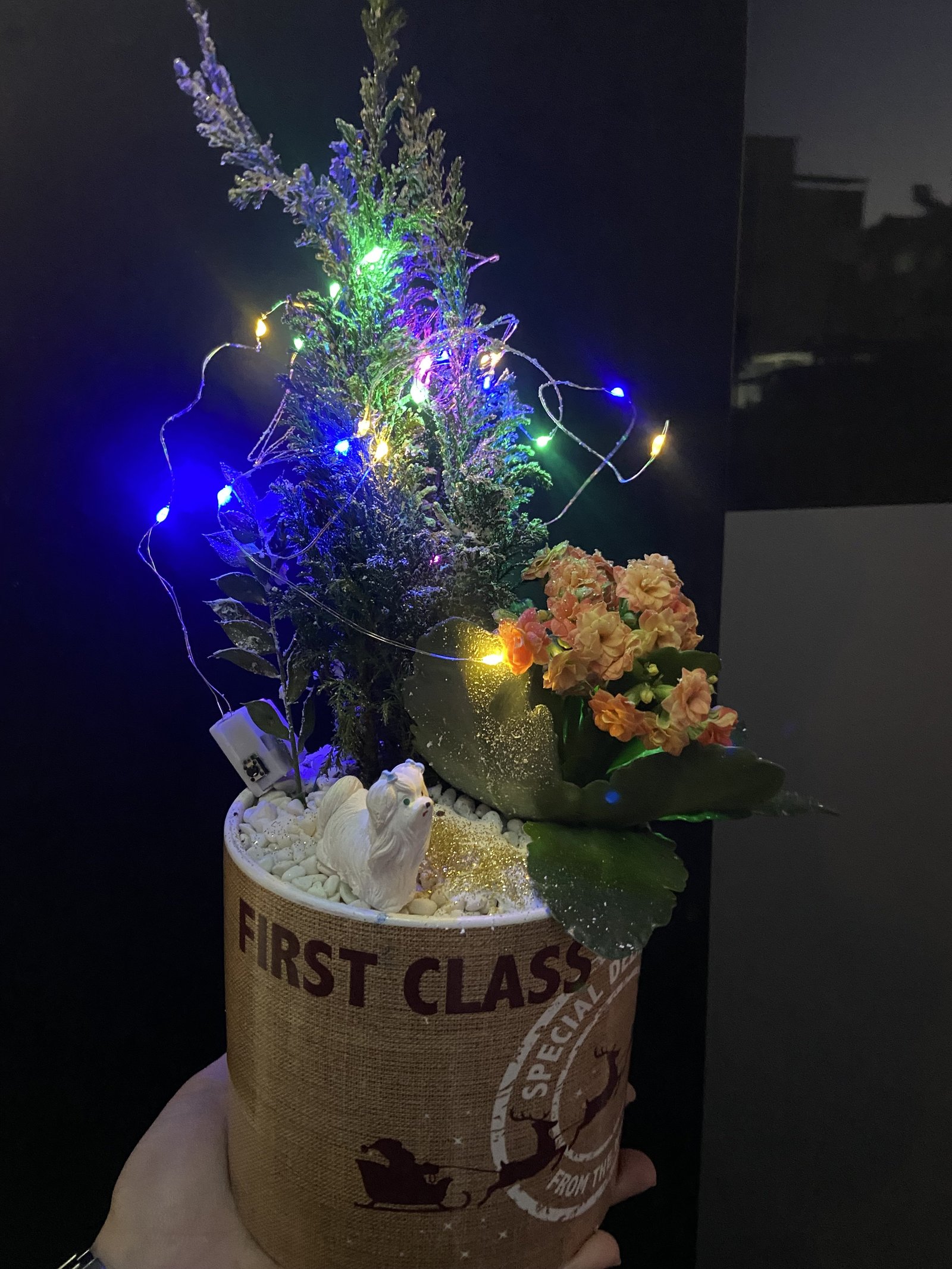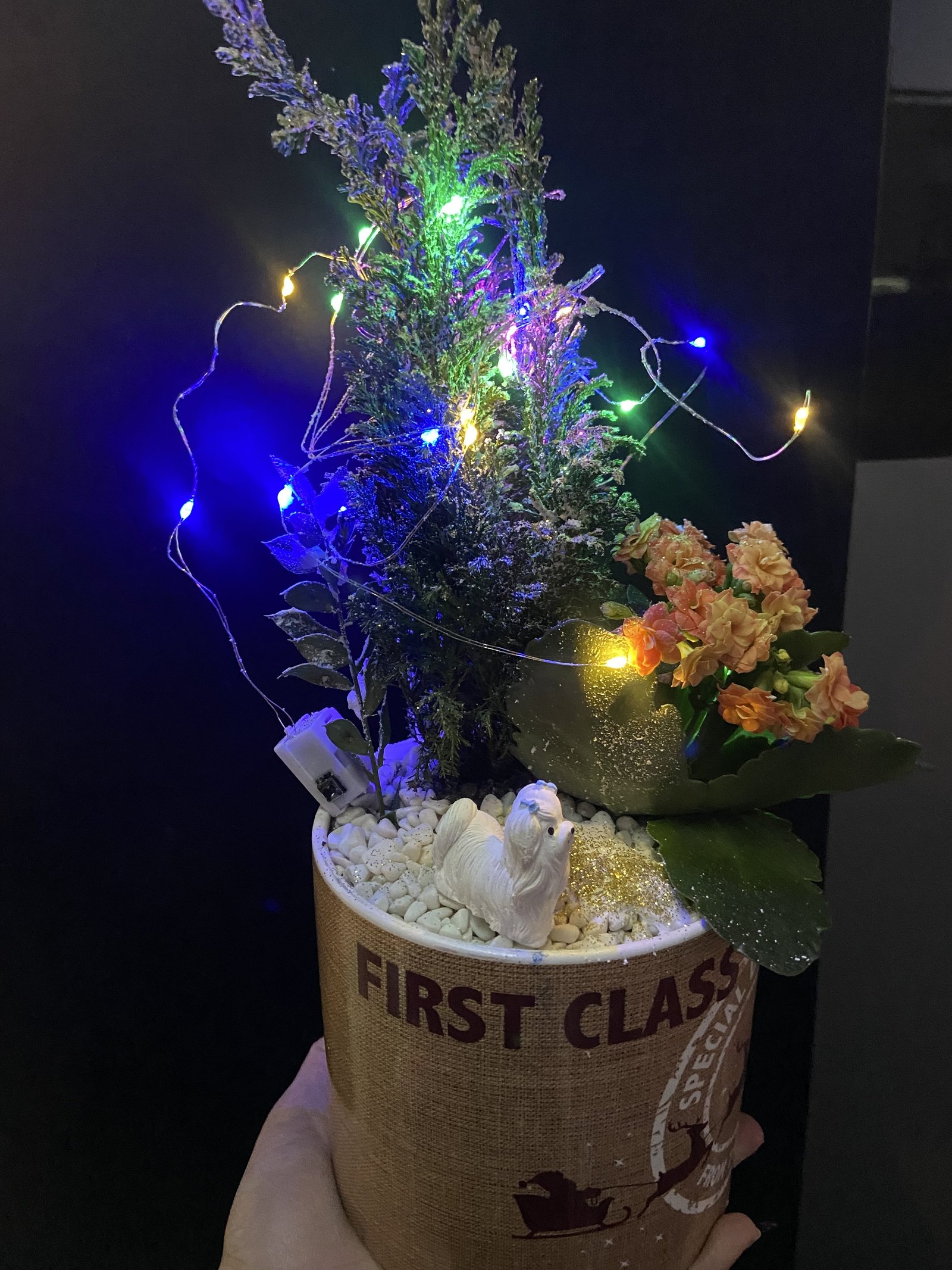 Evinize ya da sevdiklerinize hem doğal hem de dekoratif bir dokunuş katmak isteyenler için özenle hazırlanmış bu özel aranjman; canlı kalanşo çiçeği, doğal görünümlü seramik çam ağacı ve zarif ışık detayları ile dikkat çeker. Metal değil, tamamen seramik ve doğal materyaller kullanılarak hazırlanmıştır.