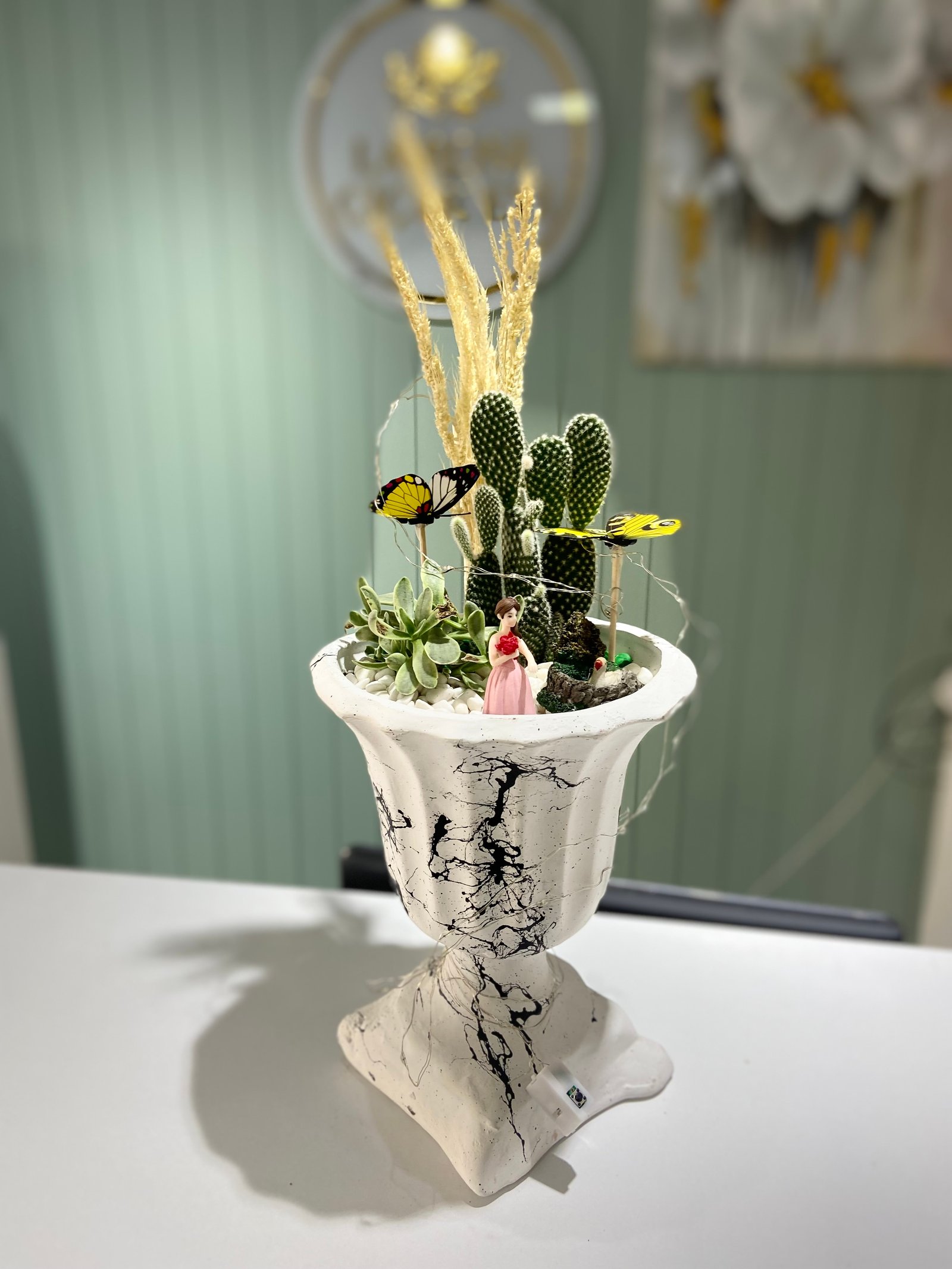 Kaktüsler, sukulentler ve zarif beyaz çiçeklerle hazırlanmış bu aranjman, hem şık hem de sade bir duruşla her ortama uyum sağlar 🤍
