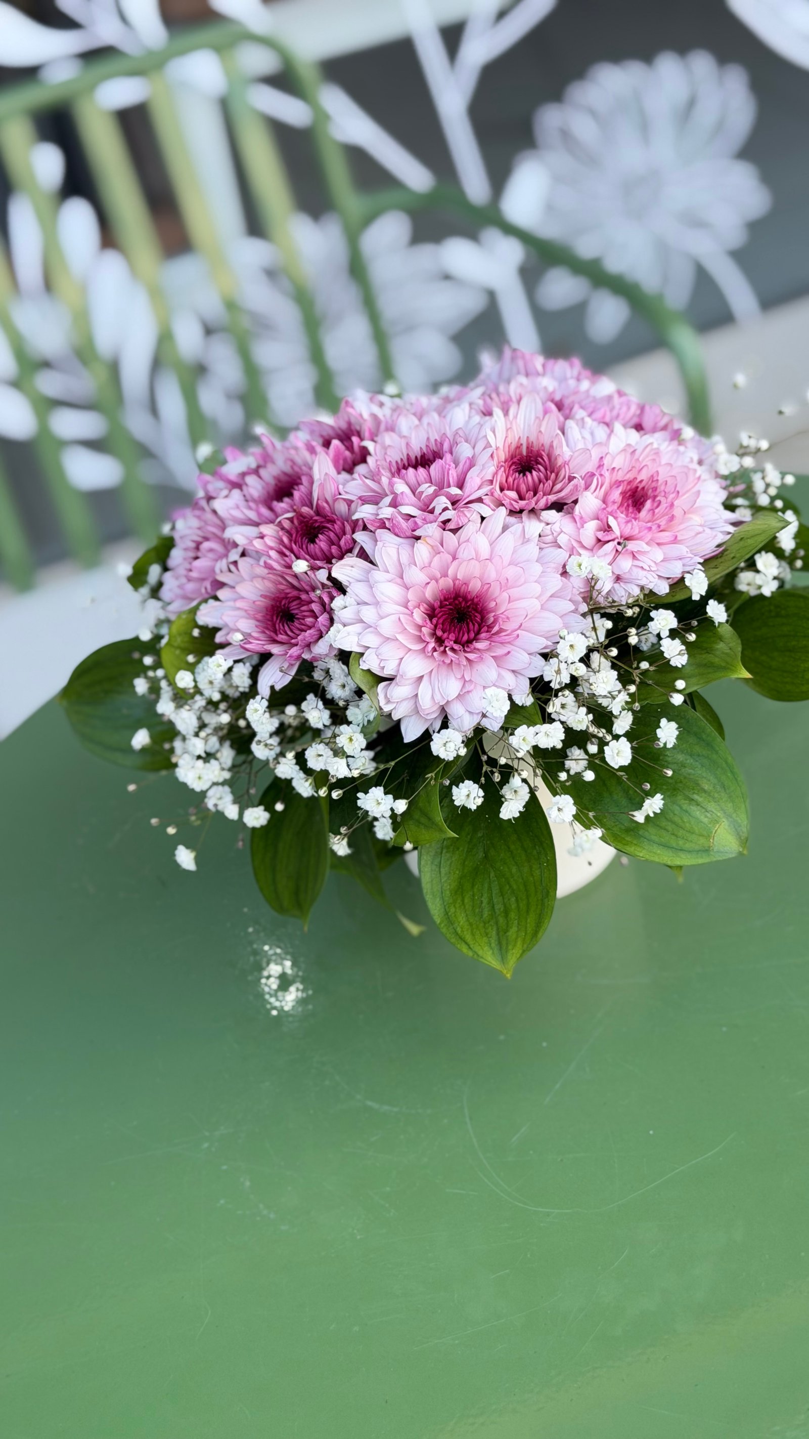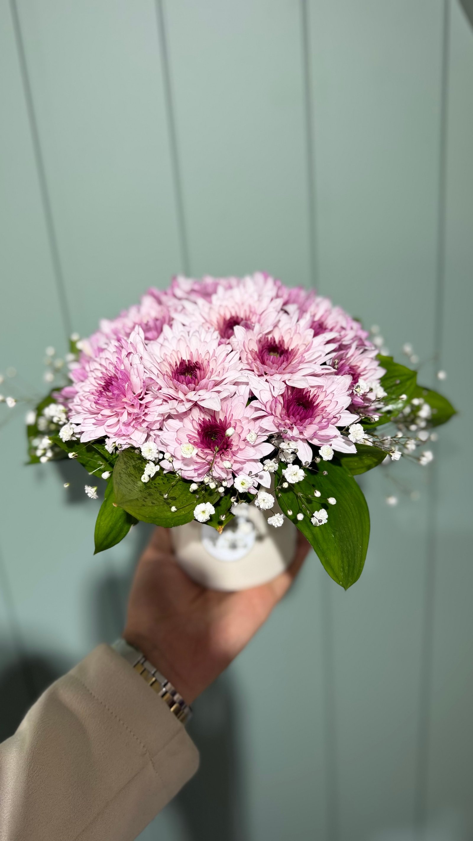 Zarafeti ve huzuru temsil eden lila tonlarındaki krizantemler, cipso çiçekleri ve yeşil yapraklarla birlikte şık bir kompozisyon oluşturur. Minimal ve modern seramik vazo içinde sunulan bu aranjman, bulunduğu ortama estetik bir dokunuş katar.