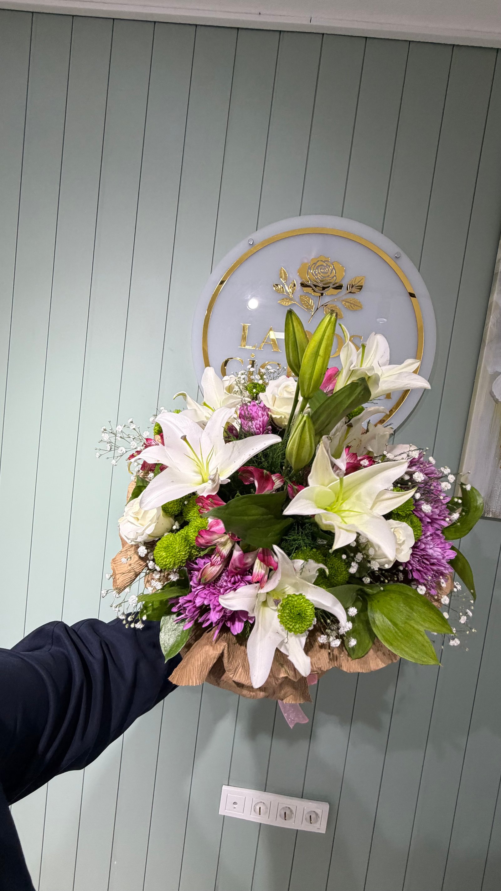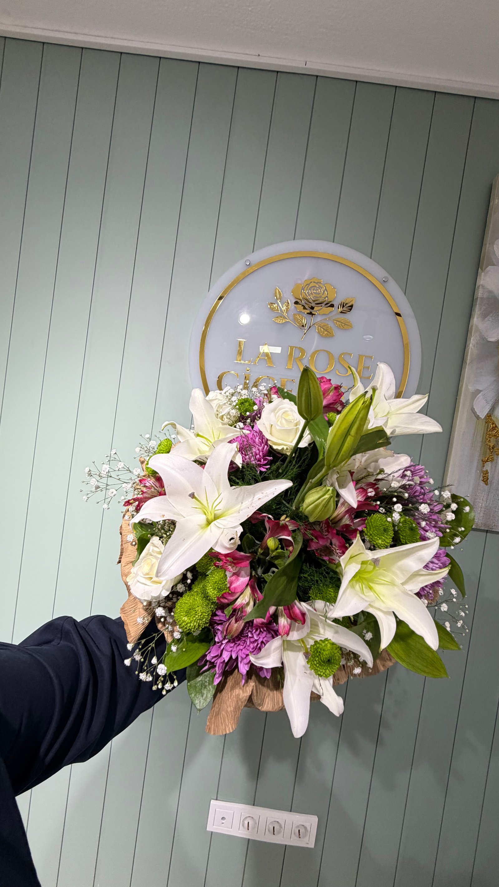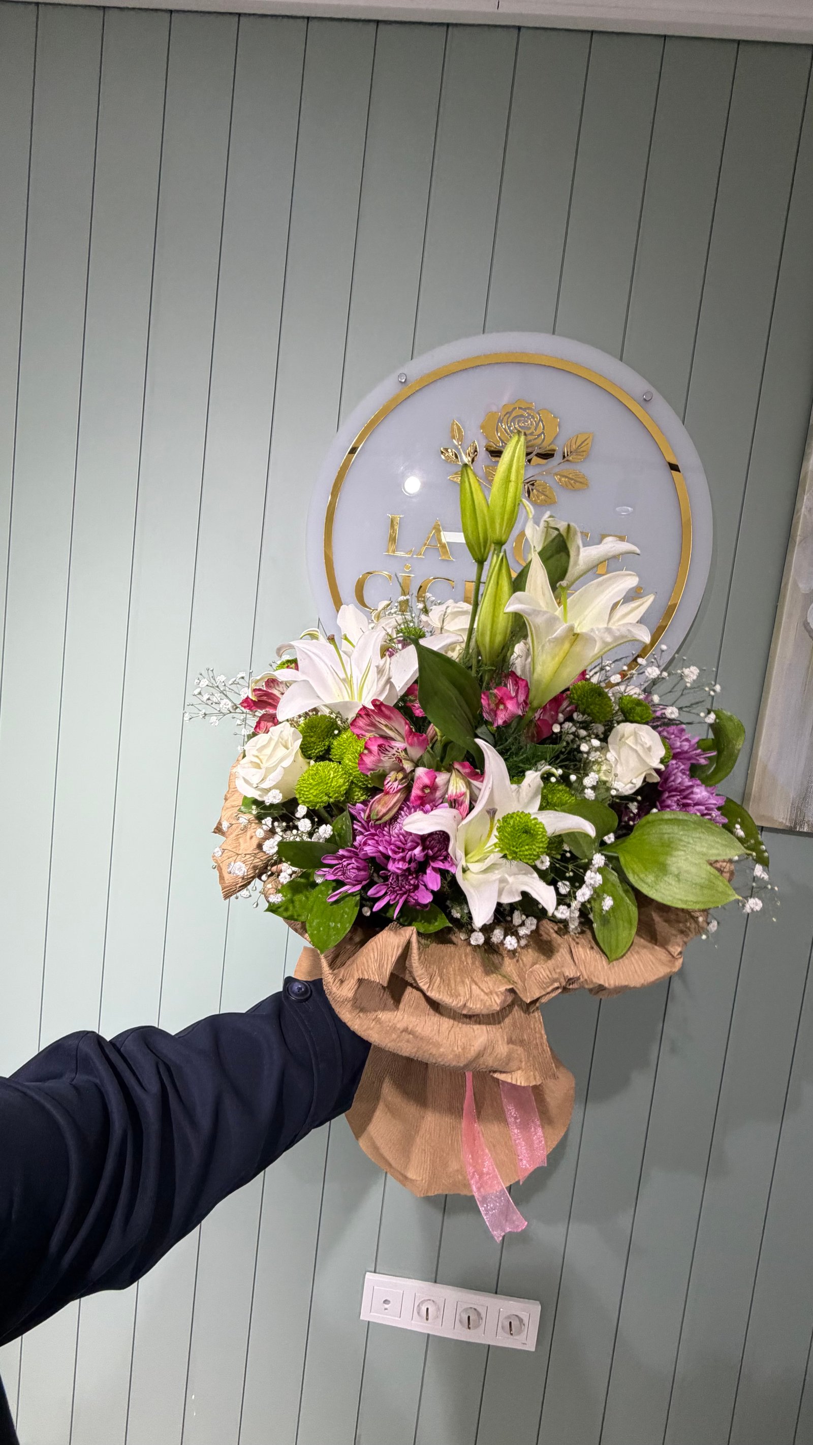 Lilyum beyaz gül ve renkli mevsim çiçekleri buketi günü güzelleştiren buketimizdir. Özel olarak hazırlandı.