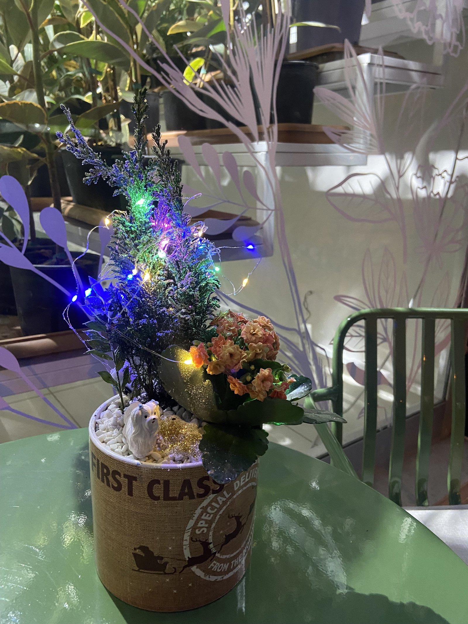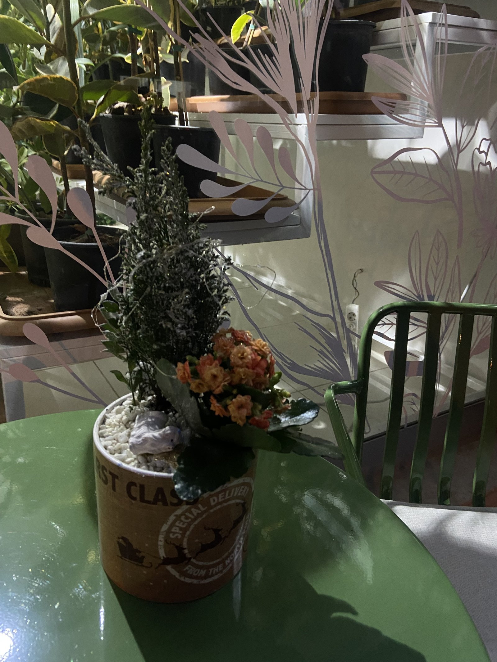 Evinize ya da sevdiklerinize hem doğal hem de dekoratif bir dokunuş katmak isteyenler için özenle hazırlanmış bu özel aranjman; canlı kalanşo çiçeği, doğal görünümlü seramik çam ağacı ve zarif ışık detayları ile dikkat çeker. Metal değil, tamamen seramik ve doğal materyaller kullanılarak hazırlanmıştır.